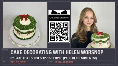 Join Helen’s Cake Shoppe for an evening of cake decorating! This class will include 2 hours of decorating time and a 6” chocolate or vanilla holiday themed cake to take home (feeds 12-15). No cake decorating experience is required for this class. Cake will be pre-stacked and crumb coated, so all you need to do is show up and decorate! You can enjoy your cake right away or freeze and store it for Christmas.